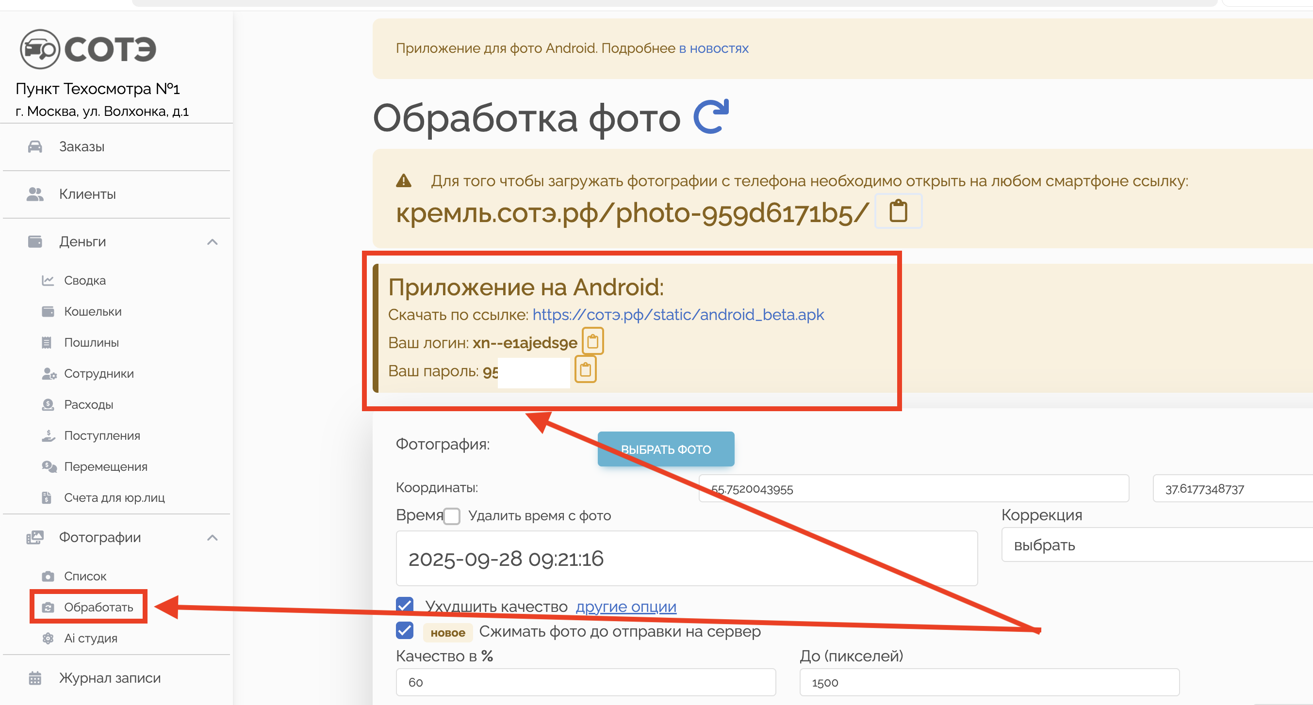 Логин пароль доступен в личном кабинете в разделе Фотографии -> Обработать или через поддержку